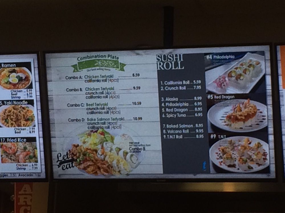 In: imitation crabmeat, avocado, cucumber, out: eel, and avocado.